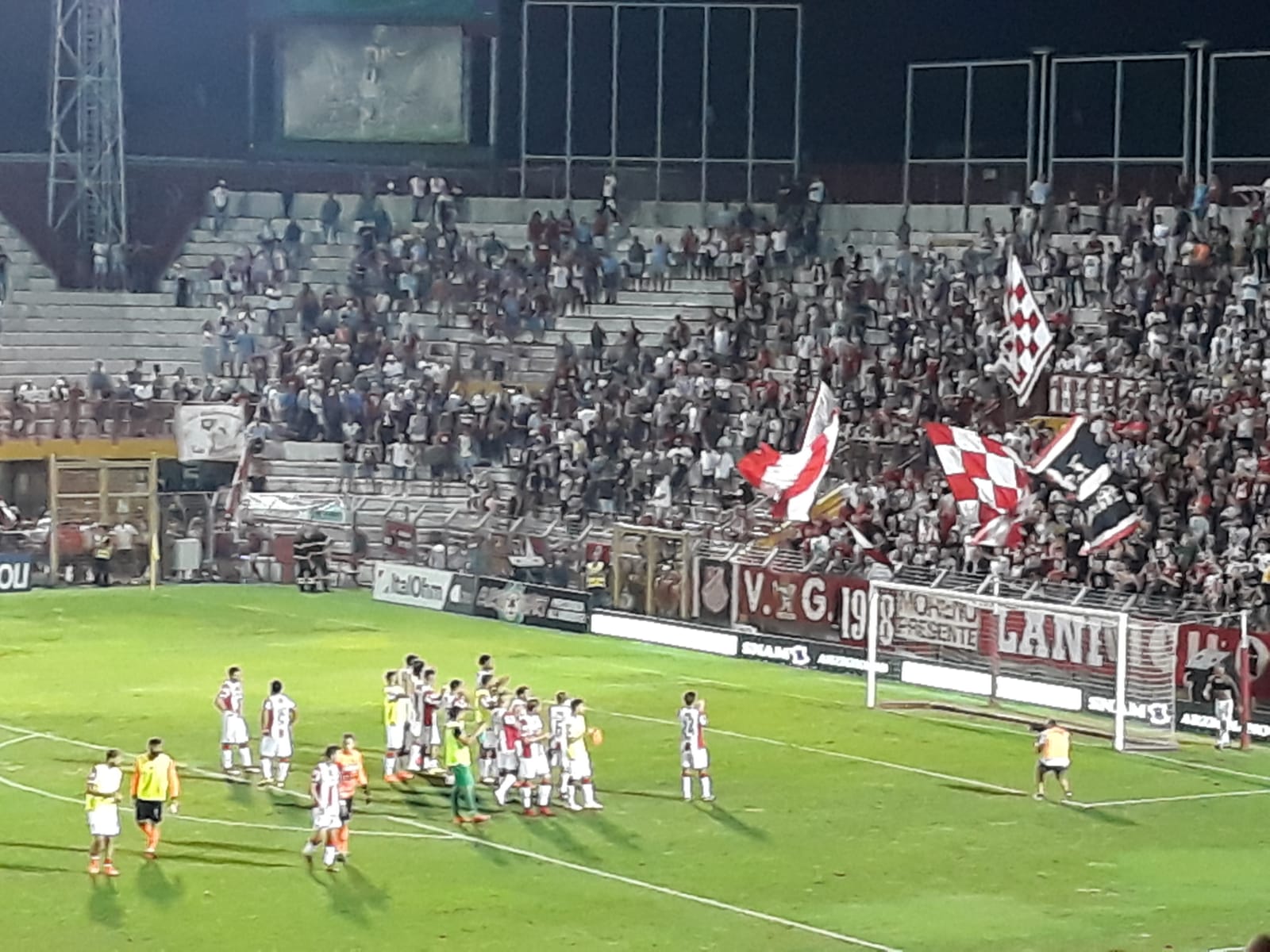 Finisce in parità l’esordio del nuovo L.R Vicenza davanti al pubblico del Menti: In questa bellissima giornata sono 8.419 gli spettatori. Dopo circa 15 anni in Curva Sud, cuore del tifo biancorosso tornano i tamburi, ed è esposto al centro della curva lo striscione anni ottanta dei Vigilantes, per riocordare il loro quarantesimo anno dalla fondazione.